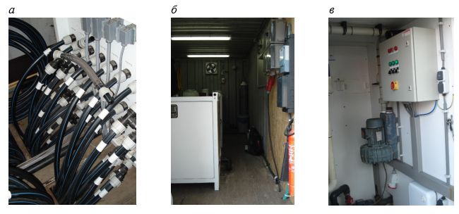 Рис. 15. Внутреннее оборудование контейнера: а – подводящие электрические кабели и шланги; б – общий вид помещения, в – система электрического питания (фото В.А. Королева)