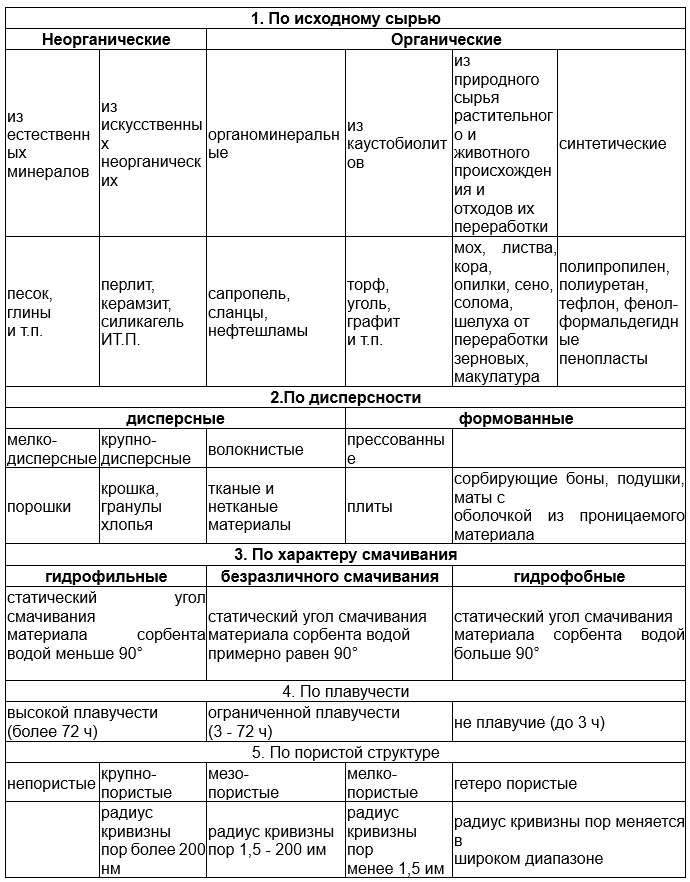 Таблица 6. Классификация сорбентов, используемых при очистке грунтов от углеводородных загрязнений (