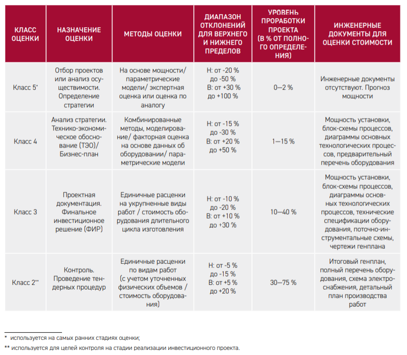 Методология оценки капитальных вложений, основанная на международном стандарте классификации смет (AACE CLASSIFICATION STANDARD), кратко представлена в таблице 1.