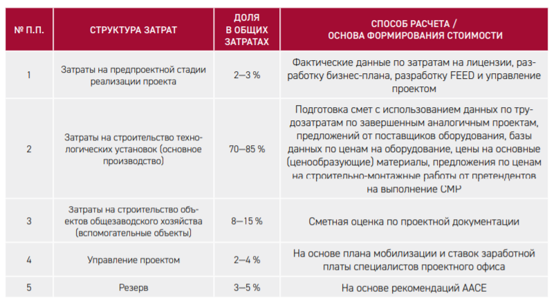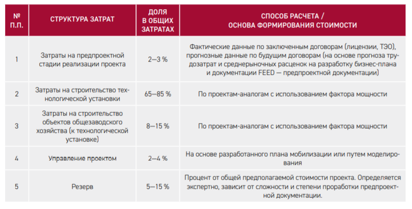 Типовая структура затрат и основа для формирования стоимости инвестиционного проекта в ряде объектов промышленного строительства представлена в таблице 2.