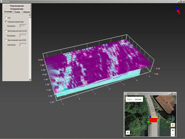Такое обследование позволяет выполнять детальную систему наблюдений с шагом между параллельными профилями 5 – 10 см, при этом все профили имеют точную привязку. Применяемое программное обеспечение для обработки отснятого материала по такой системе профилей позволяет построить наглядную трехмерную модель отснятого фрагмента бетонной плиты и выделить все конструктивные элементы, трещины, дефекты, аномальные зоны как внутри бетонной конструкции, так и на контакте бетонной плиты с грунтовым основанием.