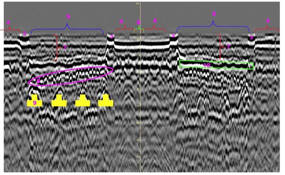 Выполненные горизонтальные срезы на необходимой глубине позволяют наилучшим образом представить результаты геофизической съемки: выделить распространение в плане существующих инженерных сооружений и коммуникаций, помогают выделить и закартировать расположение скрытых фундаментов, захоронений, дефектов в бетонных конструкциях, областей повышенной влажности и зоны разуплотнения на контакте железобетонных плит с насыпными грунтами.
