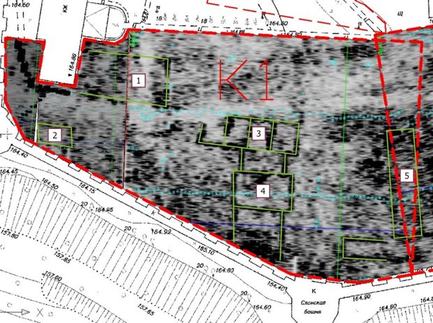 В данном случае наиболее информативными оказались результаты, представленные в виде горизонтальных амплитудных срезов по каждому участку (рис. 3). Аномалии, имеющие четкую геометрическую форму и соответствующие, по нашему мнению, контурам древних фундаментов, наилучшим образом проявляются на глубине от 0,7 до 1,2 м. По результатам геофизических работ был составлен план расположения объектов, что позволило оптимизировать работу археологов. Все геофизические построения совпали с полученными впоследствии данными археологических раскопок (рис. 4).