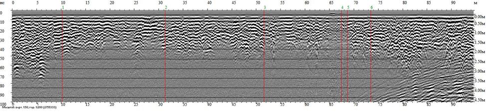 Рис. 2. Один из продольных георадарных профилей, выполненных при обследовании территории Воскресенского Ново-Иерусалимского монастыря