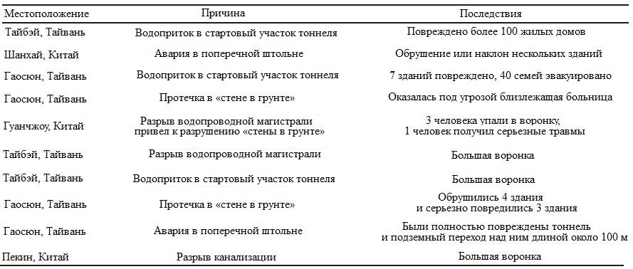 Таблица 1. Значительные аварии при строительстве метро, вызванные подземными водами, в Азиатско-Тихоокеанском регионе с 2001 по 2006 год