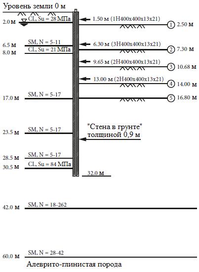 Рис. 2. Полусечение котлована и прилегающего к нему грунта (CL –низкопластичная глина; SM – пылеватый песок или пылеватый песок с гравием)