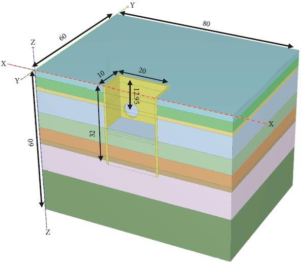 В работе Сюна с соавторами 2016 года [8] такой же котлован используется при моделировании как стартовый – для запуска щита в работу. Этот котлован крепится железобетонной «стеной в грунте» толщиной 0,9 м и глубиной 32 м с дополнительными горизонтальными распорками на четырех уровнях. Максимальный уровень выемки достигает 16,8 м ниже дневной поверхности. На рисунке 2 представлено полусечение котлована и прилегающего к нему грунта. Была разработана полусимметричная модель котлована, размер которой был принят следующим: 80 м X 60 м X 60 м. В целом границы котлована были приняты в незастроенных местах в достаточно прочных грунтах. Полученная модель состояла из 93 847 десятиузловых тетраэдрических элементов с общим количеством узлов 132 018. Для зоны усиленного грунта использовалась очень мелкая сетка, а для остальных зон – сетка стандартной крупности. Эта трехмерная модель представлена на рисунке 3. Анализ выполнялся с помощью программного комплекса PLAXIS 3D версии 2016 года.