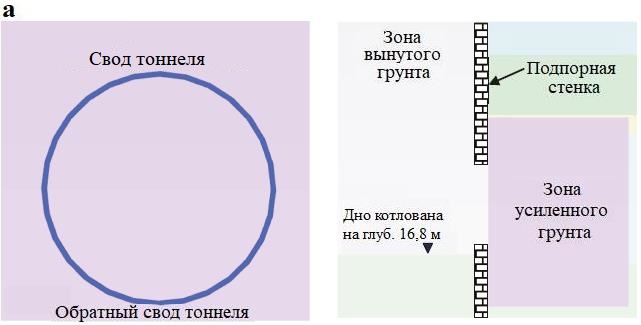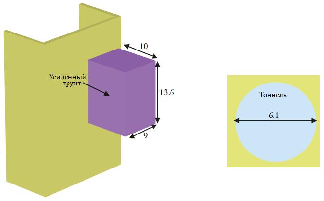 Диаметр стартового участка тоннеля, который должен соответствовать внешнему диаметру проходческого щита и использоваться для начала проходки, был принят равным 6,1 м. Глубина центра этого участка была принята равной 12,95 м ниже поверхности земли. Как указывалось выше, грунты за подпорной стенкой котлована должны быть усилены так, чтобы снизилась их водопроницаемость и повысилась их прочность. Были приняты следующие размеры зоны усиленного грунта, прилегающей к котловану: длина 10 м, ширина 9 м и толщина 13,6 м. На рисунке 4 представлены детали по стартовому участку тоннеля и зоне усиленного грунта, принятые при моделировании.