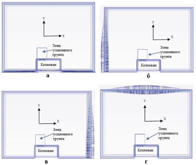 Рис. 5. Граничные условия по воде в модели (вид в горизонтальной плоскости): а – закрыта плоскость Ymin; б – открыта плоскость Xmin; в – открыта плоскость Xmax; г – открыта плоскость Ymax