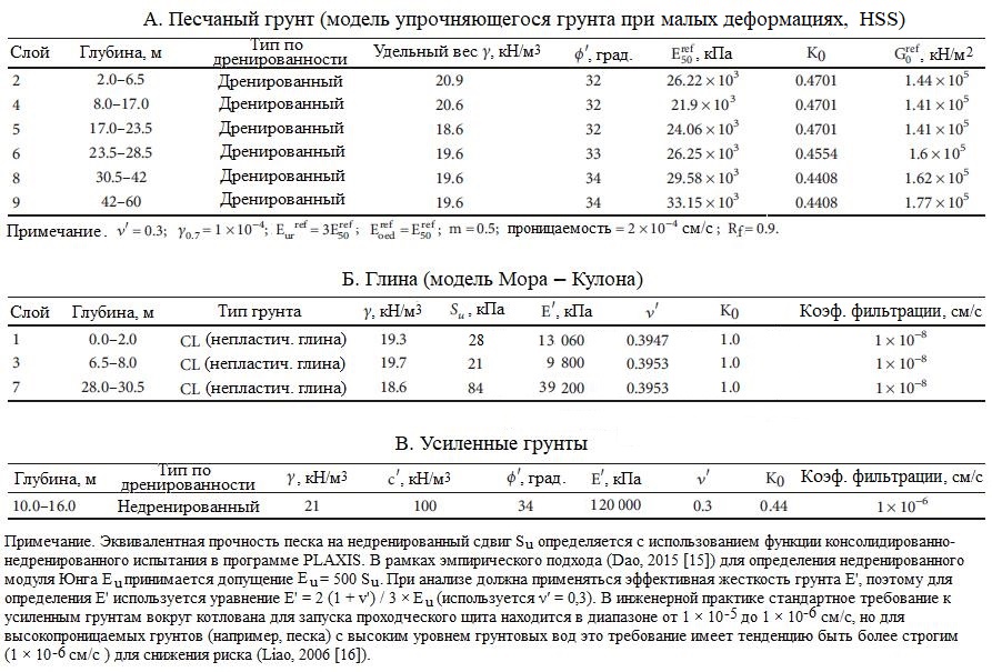 Поскольку основное внимание в настоящем исследовании уделялось механизму разрушения, вызванному водопритоком из-за врезки проходческого щита, необходимо было вместо упругопластического анализа выполнить фильтрационный расчет. Разрез грунта при получении модели был принят таким же, как и в работе Сюна с соавторами 2016 года [8]. При этом для исходных песчаных грунтов использовалась комплексная геомеханическая модель, в которой особое внимание уделяется поведению грунтов при малых деформациях (модель упрочняющегося грунта при малых деформациях, HSS, HS-small). Однако для глин и усиленных грунтов из-за ограничений, связанных с доступными входными параметрами, вместо этого применялась идеальная упругопластическая модель Мора – Кулона c типом поведения по условиям дренирования Undrained B. Входные параметры усиленных грунтов были взяты по работе Дано и др. [9]. Для моделирования железобетонной «стены в грунте» использовалась линейно-упругая модель. Для распорок применялись анкерные элементы для поперечного и продольного относительно оси будущего тоннеля направлений соответственно. Подробные сведения о входных параметрах грунта и конструкций, использованных для анализа, представлены в таблице 2.