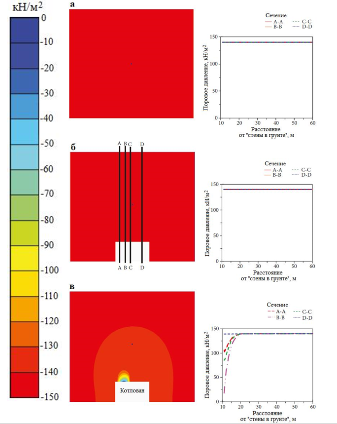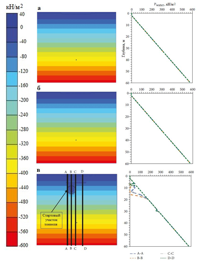 Рис. 7. Изменения в распределении порового давления в поперечном относительно оси будущего тоннеля сечении на разных этапах запуска проходческого щита в работу, таких как: а – начальный этап; б – основная выемка грунта; в – врезка щита. Примечания: A-A – левая сторона стартового участка тоннеля; B-B – центр тоннеля; C-C – правая сторона стартового участка тоннеля; D-D – в 5 м от правой стороны стартового участка тоннеля; Pwater – поровое давление; знак «-» на цветовой шкале означает положительное поровое давление на рисунках а, б, в