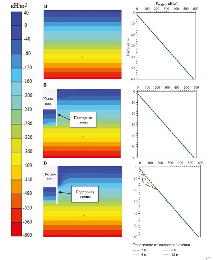 Чтобы дополнительно продемонстрировать влияние подземных вод на ситуацию при врезке проходческого щита, на рисунке 8 показано распределение порового давления в грунтах за подпорной стенкой в продольном относительно оси будущего тоннеля сечении. На этом же рисунке представлены графики зависимости порового давления от глубины для грунтов, расположенных на расстояниях 2, 4, 8 и 12 м от стенки. Подобно распределению, показанному для поперечного сечения (см. рис. 7), значения данного параметра на этих графиках (см. рис. 8) остаются почти одинаковыми для всех указанных расстояний во время основной выемки грунта. Из-за оттока подземных вод наблюдается снижение порового давления на 60 кПа (по сравнению с начальным этапом) в зоне обратного свода тоннеля на расстоянии 2 м от подпорной стенки. Врезка проходческого щита влияет на поровое давление на этом расстоянии в несколько большей степени, чем в области стартового участка, только на глубине примерно от 7 до 18 м как показано на рисунке 8, в. Однако по мере удаления от подпорной стенки это влияние постепенно уменьшается. На расстоянии 12 м от стенки врезка щита не вызывает изменений порового давления.