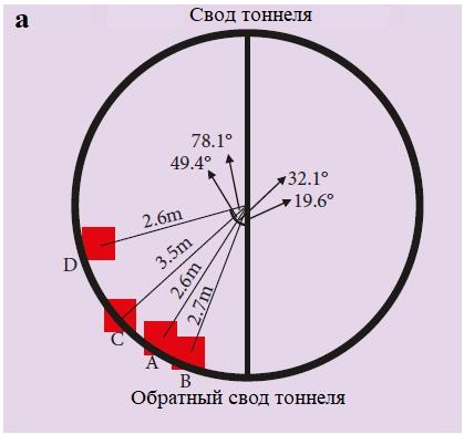 Рис. 6. Точки разрушений при врезке проходческого щита на поперечном (а) и продольном (б) относительно оси будущего тоннеля сечениях (на продольном сечении – сразу за плоскостью подпорной стенки)