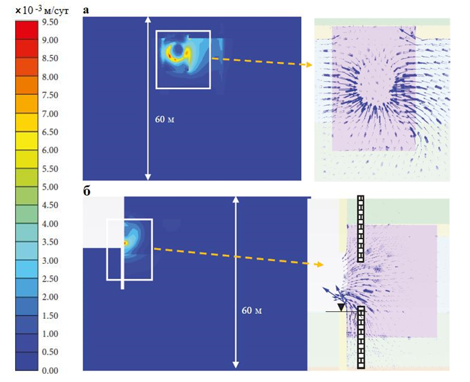 Рис. 12. Коэффициенты фильтрации (слева) и линии тока (справа) при нарушениях, вызванных врезкой проходческого щита на поперечном (а) и продольном (б) относительно оси будущего тоннеля разрезах. Цветовая шкала – коэффициенты фильтрации