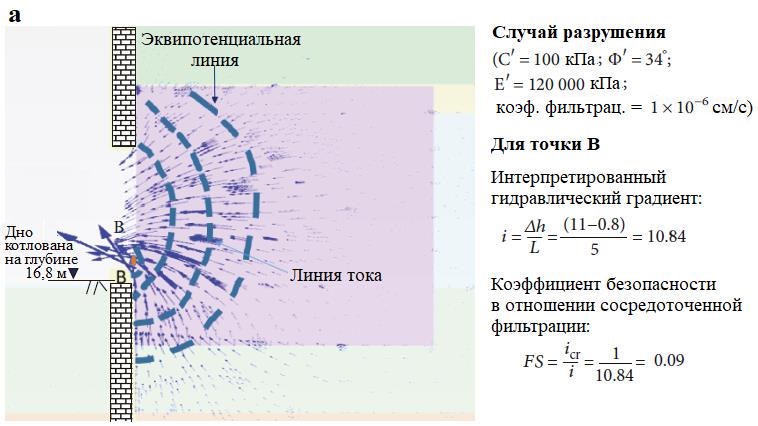 Оу [13] показал, что откопка котлована в грунте с высокой водопроницаемостью может привести к разрушению грунтов вследствие сосредоточенной фильтрации (суффозионного процесса, разрушения гидродинамическим давлением), что также тесно связано с подземными водами, а Пратама и Оу [14] провели исследование с использованием как численного анализа, так и эмпирического подхода к интерпретации коэффициента безопасности по суффозионному выносу. Как указывалось ранее, могут быть представлены линии тока, вызванного врезкой щита, но использованное авторами программное обеспечение не имело функции для представления эквипотенциальной линии и гидродинамической сетки. Следовательно, потребовалось личное суждение специалиста, чтобы можно было интерпретировать гидравлический градиент и коэффициент безопасности на основе гидростатического напора (давления) и координат соответствующих узлов в модели. Схематический рисунок и сетка фильтрации, а также расчет коэффициента безопасности для оценки суффозии представлены на рисунке 13, а. Полученный коэффициент безопасности составил всего 0,09, что должно привести к вымыванию грунта при врезке проходческого щита.