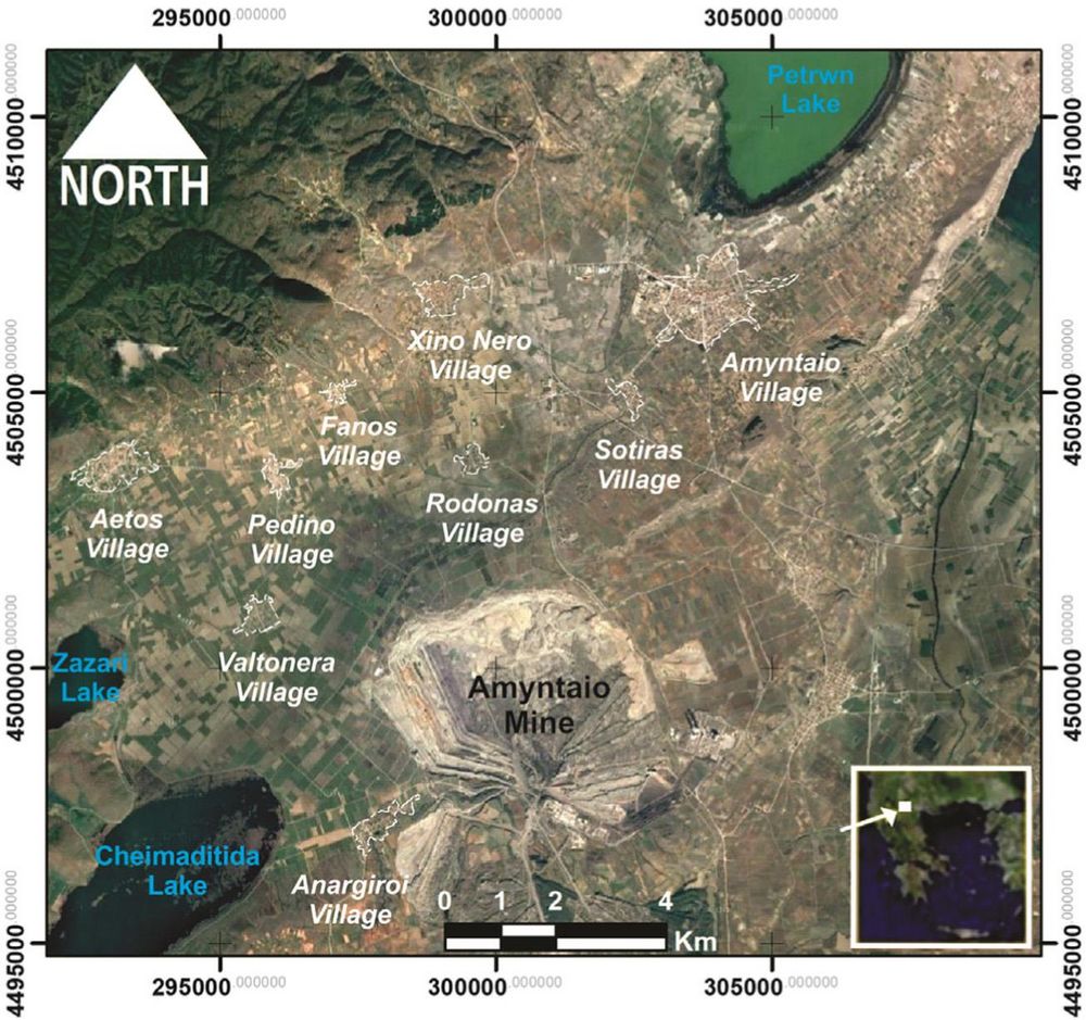 Тзапоглу и Лупасакис [1] остановились на исследовании медленного оседания поверхности земли, которое в последние десятилетия постоянно происходит на территориях сельхозугодий и населенных пунктов вокруг угольного карьера Аминдео (Amyntaio, греч. Αμύνταιο) в периферийной единице Флорина периферии Западная Македония на севере Греции (рис. 1). Этот процесс вызван чрезмерной откачкой грунтовых вод через дренажные скважины для осушения вышеназванного угольного карьера и через скважины системы орошения сельскохозяйственных земель на окружающей равнине. В результате оседание распространилось уже на расстояние 4 км вокруг карьера и нанесло значительный ущерб населенным пунктам Анаргири (Anargiroi), Валтонера (Valtonera), Фанос (Fanos) и другим, а также дорожной сети.