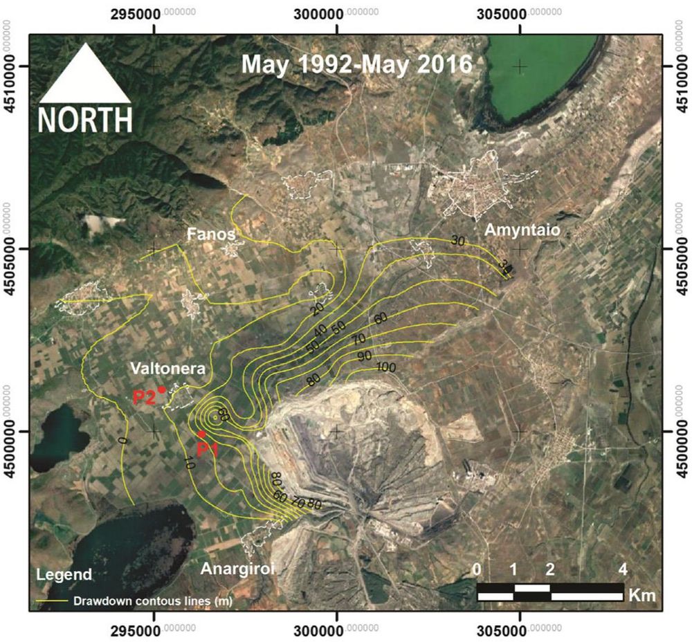 Авторы работы [1] приводят очень удачное сравнение: в настоящее время угольный карьер Аминдео работает наподобие гигантской скважины на воду, в результате чего образуется депрессионная воронка, простирающаяся на километры вокруг. Последняя также включает в себя более мелкие динамические депрессионные воронки, образовавшиеся при работе скважин для оросительных систем. Например, на пьезометрической карте по состоянию на май 2016 года (рис. 4) лучше всего просматриваются две такие воронки  к ВЮВ от Валтонеры (Valtonera) и к ЮЮВ от Фаноса (Fanos).