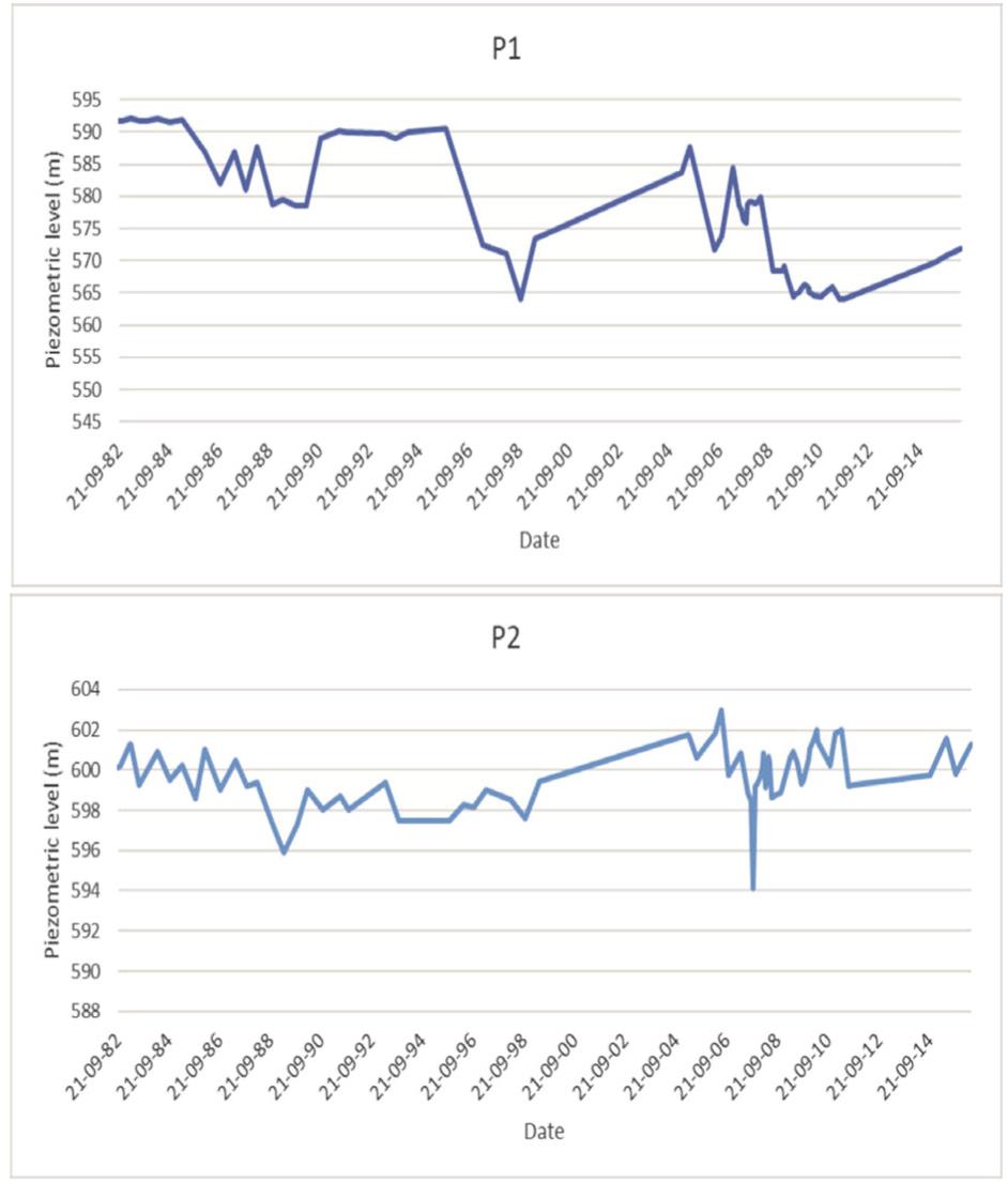 Результаты измерений пьезометрических уровней в точках P1 и P2 (см. рис. 4) с 21 сентября 1982 года по 21 сентября 2014 года, представленные на рисунке 5 в графической форме, показывают, что для более близкой к угольному карьеру точки P1 хорошо заметна тенденция к снижению уровня грунтовых вод за 32 года. Более подробные литературные данные и полевые измерения показали, что уровень воды в водоносном горизонте на территории угленосного суббассейна Аминдео в последние десятилетия действительно имеет устойчивую тенденцию к снижению (скорее всего связанную с непрерывным потоком грунтовых вод в сторону карьера из-за работы скважин, осуществляющих его дренаж), но имеет сезонные колебания (вероятнее всего связанные с чрезмерной откачкой воды из скважин оросительной системы в сезон полива сельскохозяйственных культур).