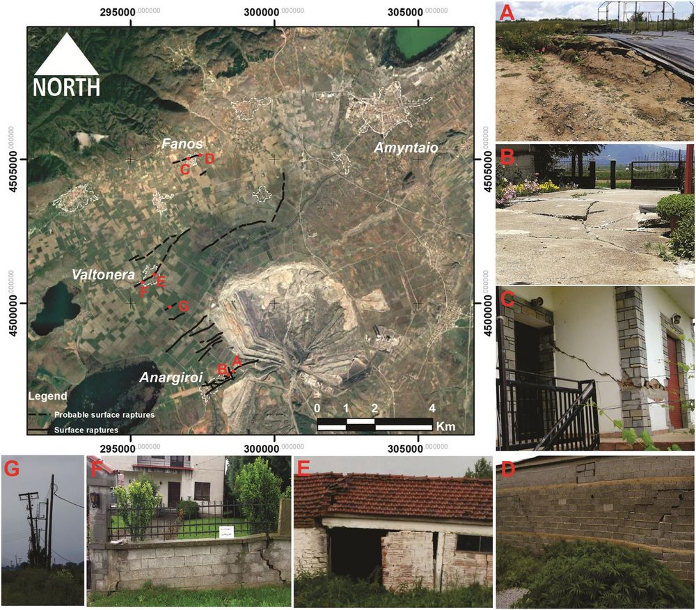 На основе подробной карты, составленной авторами статьи [1] по результатам обширных полевых исследований, они разделили разрывы поверхности на две категории (рис. 6). Большинство из них имеют направление СВЮЗ и параллельны тектоническим разломам, затрагивающим четвертичные геологические формации. Остальные имеют направление СЗЮВ и параллельны тектоническим разломам, затрагивающим предальпийские геологические формации. На этой основе Тзапоглу и Лупасакис [1] делают вывод, что совершенно очевидна корреляция разрывов поверхности с пространственным распределением тектонических разломов.