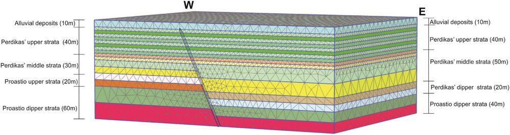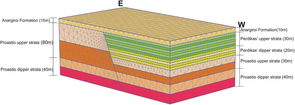 Взятый для построения модели участок территории Анаргири, расположенный в 600 м от периметра карьера, пересекается разломом Fang (см. рис. 2), имеющим амплитуду смещения 50 м. Как видно из рисунка 7, на северо-западной стороне (справа от разлома) между анаргирийской (Anargiroi) и проастиосской (Proastio) свитами залегает пердикасская (Perdikas) свита, тогда как на юго-восточной стороне (слева от разлома) последняя отсутствует.