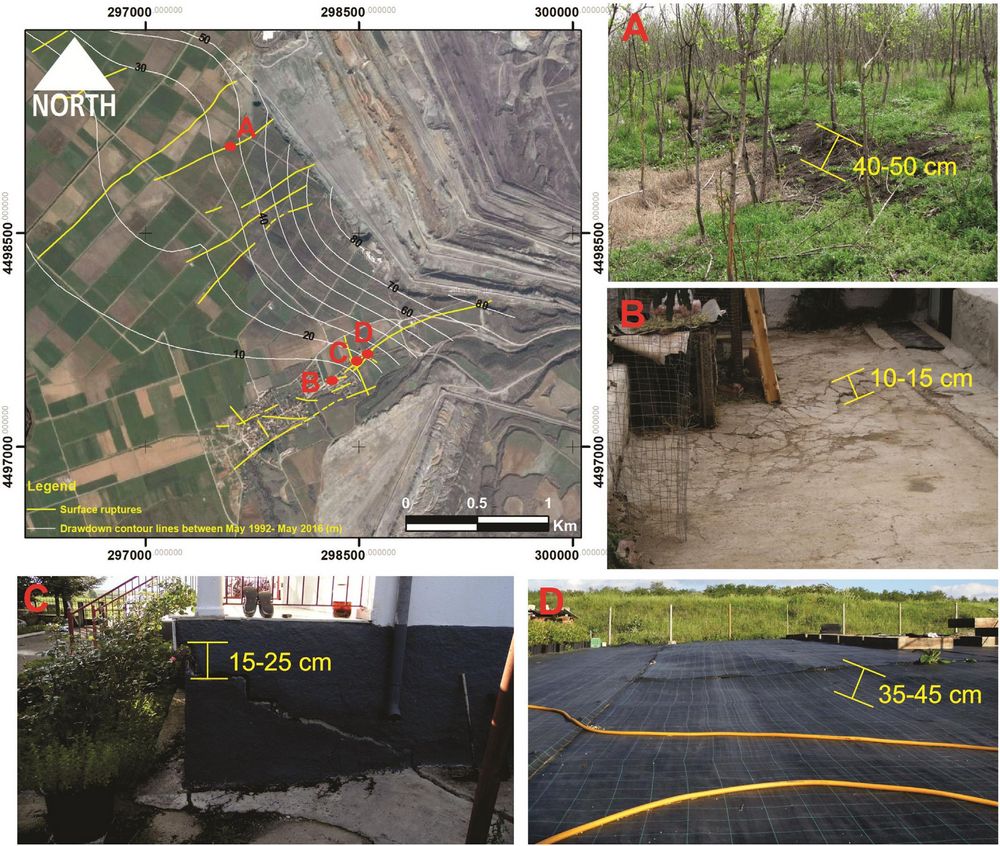 Для подтверждения достоверности результатов моделирования, полученных в PLAXIS 3D, авторами работы [1] были выполнены полевые измерения вертикальных смещений по разрывам поверхности в Анаргири (на более широкой территории, чем участок моделирования), которые оказались хорошо согласованными с итогами анализа методом конечных элементов. Некоторые из результатов измерений представлены на рисунке 9. Видно, что чем больше снижение УГВ под той или иной точкой (и чем она ближе к периметру угольного карьера), тем больше вертикальное смещение в месте разрыва (4050, 3545, 1525, 1015 см в точках A, D, C, B соответственно). Сами измеренные вертикальные смещения по разрывам были близки к полученным при моделировании.
