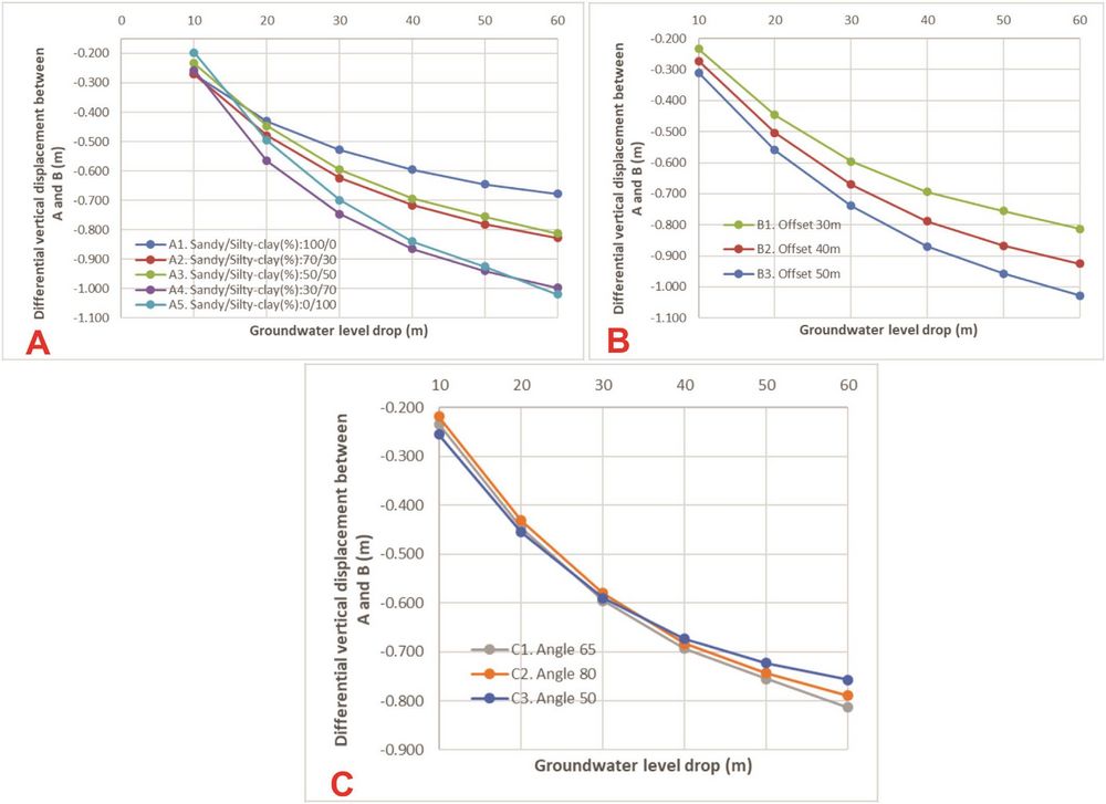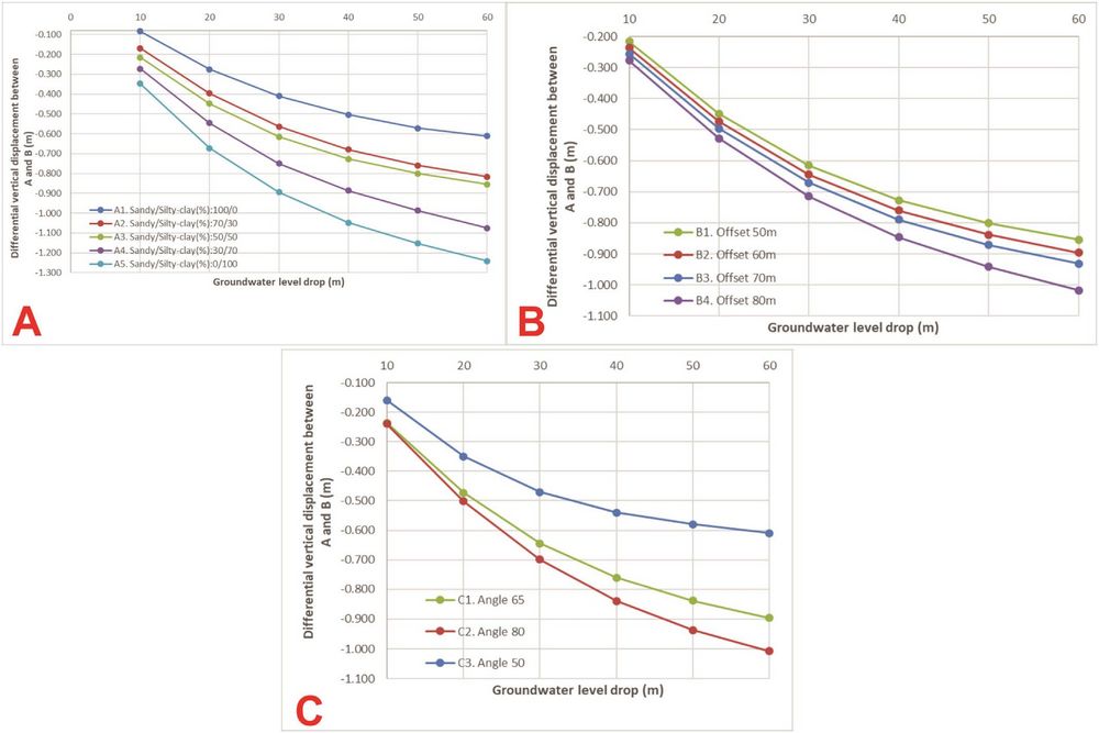При третьем сценарии при прочих равных условиях оценивалось влияние угла падения плоскости разлома. Было выполнено 3 серии расчетов для углов падения 65, 80 и 50 град. При этом для каждого из этих трех случаев вводились амплитуда смещения по разлому 50 м, процентное соотношение «песок / пылеватая глина» 50/50 и поэтапно увеличивалось снижение уровня воды в водоносном горизонте  на 10, 20, 30, 40, 50 и 60 м. На рисунке 10, C показаны итоги расчетов  кривые С1, С2, С3, соответствующие вышеуказанным углам падения плоскости разлома (в том же порядке). Из рисунка видно, что чем больше угол падения плоскости разлома, тем ниже идет кривая, то есть тем больше осадки поверхности земли.