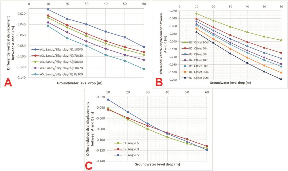 При втором сценарии при прочих равных условиях изучалось влияние амплитуды смещения по разлому. Было выполнено 7 серий расчетов для смещений 10, 20, 30, 40, 50, 60 и 70 м. При этом для каждого из этих семи случаев вводились угол падения плоскости разлома 65 град., процентное соотношение «песок / пылеватая глина» 50/50 и поэтапно увеличивалось снижение уровня воды в водоносном горизонте  на 10, 20, 30, 40, 50 и 60 м. На рисунке 13, B показаны результаты расчетов  кривые B1, B2, B3, B4, B5, B6, B7, соответствующие вышеуказанным амплитудам смещений (в том же порядке). Из рисунка видно, что чем больше смещение по разлому, тем ниже идет кривая, то есть тем больше оседание поверхности земли.