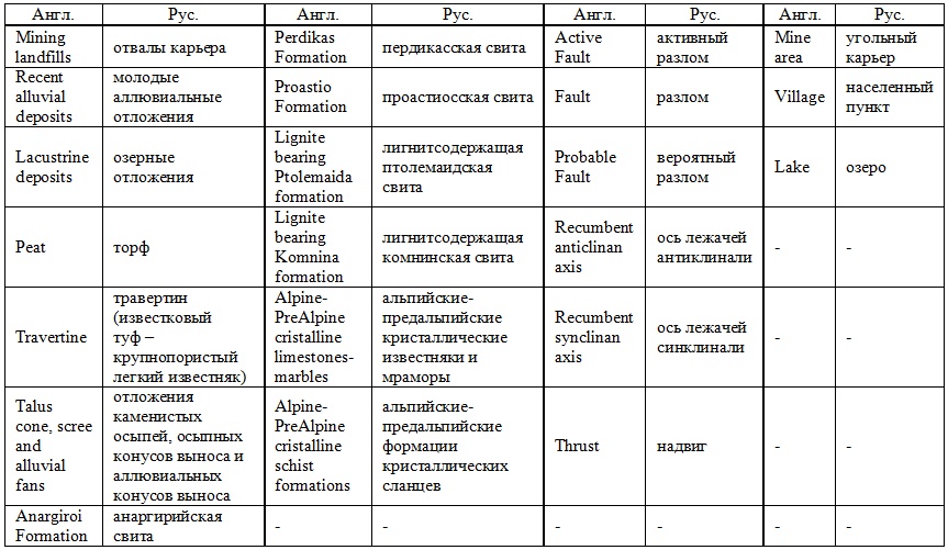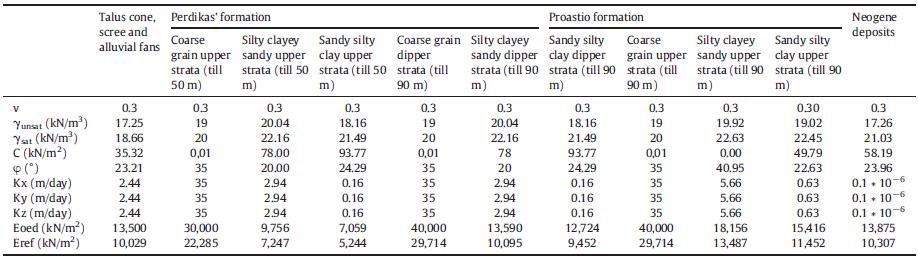 Таблица 4. Параметры отложений осыпей, осыпных и аллювиальных конусов выноса (talus cone, scree and alluvial fans), грунтовых слоев пердикасской (Perdikas) и проастиосской (Proastio) свит на изучаемом участке населенного пункта Фанос [1]