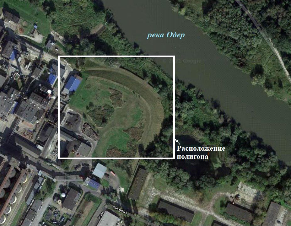 Исследовательская работа, проведенная в период с 1997 по 2015 год кафедрой геотехники и геодезии Опольского технологического университета, включала геодезический и геотехнический мониторинг откоса, спускающегося в сторону правого берега реки Одер, и насыпной дамбы в его верхней части в промышленной зоне города Бжег (Польша). Это сооружение защищает отстойники полигона для жидких отходов предприятия пищевой промышленности от речных паводковых вод и одновременно саму реку от возможного загрязнения (рис. 1) [9]