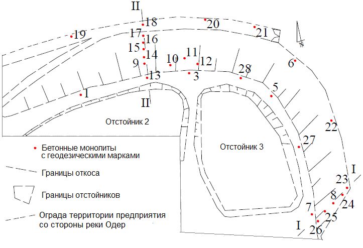 Исходно измерения проводились для ранее установленных нивелирных знаков, расположение которых определялось индивидуально и было связано со строительством и эксплуатацией исследуемого сооружения (точки 1–8). Расположение точек 9–13 (см. рис. 2) было выбрано в связи с возникновением локальной оползневой зоны. Установка следующих нивелирных знаков (14–28) была связана с обследованием откоса и зон, окружающих отстойники, в целом.