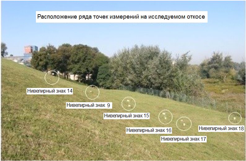 Измерения высотных отметок точек на исследуемом откосе проводятся почти ежегодно начиная с 1997 года. В какой-то момент на основе полученных результатов было установлено наличие участков, представляющих опасность для устойчивости откоса и земляной дамбы. Поэтому на этих участках в 2005 году были установлены дополнительные нивелирные знаки. Наиболее неустойчивым оказался профиль II (см. рис. 2) с точками измерений 9 и 13–18 (рис. 4). На нем также было отмечено развитие локального оползня небольшого размера, который через некоторое время стабилизировался.