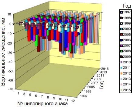 Вертикальные смещения нивелирных знаков с момента установки в 1997 году составляли к 2015 году от минус 19,5 мм (для точки 6) до минус 60,8 мм (для точки 7). Для знаков, установленных в 2005 году, результаты измерений колебались от минус 21,5 мм (для точки 22) до минус 83,5 мм (для точки 18). В 2012 году были вновь добавлены точки измерений № 13, 20, 21 и 30, так как их предшественницы были повреждены в результате работ по рекультивации отстойников. Больших вертикальных смещений в этих точках зафиксировано не было. Наибольшая осадка за многие годы съемок была отмечена для точки 7, а наименьшая – для точки 6 [18]. Результаты измерений для исследуемого земляного сооружения представлены на рисунках 5 и 6 в виде обобщенных трехмерных столбчатых диаграмм [18].