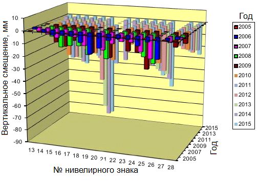 Рис. 6. Вертикальные смещения дополнительных нивелирных знаков (точек измерений № 13–28, см. рис. 2), установленных в 2005 году [18]