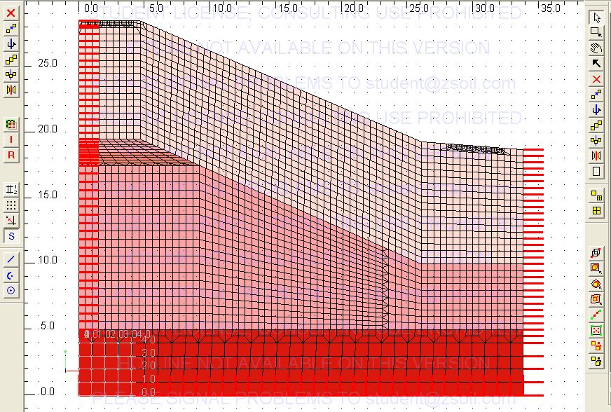 1. Рассматриваемый откос был смоделирован в конечноэлементном программном комплексе Z_SOIL от швейцарской компании ZACE Services Ltd [19] (рис. 7). Отдельные его слои помечались как макроэлементы и разбивались на входящие в них конечные элементы таким образом, чтобы сохранялась непрерывность сетки. Система автоматически моделировала заданные условия. Были установлены шарнирно-подвижно закрепленные боковые границы и шарнирно-неподвижно закрепленная нижняя граница. Базовая расчетная модель с предельными условиями показана на рисунке 7 [20].