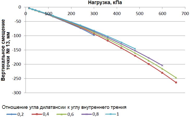 3. В качестве репрезентативной была выбрана точка измерений 13 (см. рис. 2). Для этой точки были рассчитаны вертикальные смещения при пошаговом увеличении нагрузки. На рисунке 8 представлены полученные графики разных цветов, соответствующие разным отношениям угла дилатансии к углу внутреннего трения (Ψ‘/ ϕ‘). Как видно из рисунка 8, не при каждом отношении получались полные кривые «нагрузка – осадка». Как правило, чем раньше заканчивался график, тем ближе к нулю или единице было его значение Ψ‘/ ϕ‘. Наиболее протяженные кривые были получены для относительных углов дилатансии, равных 0,4ϕ‘ и 0,6ϕ‘.