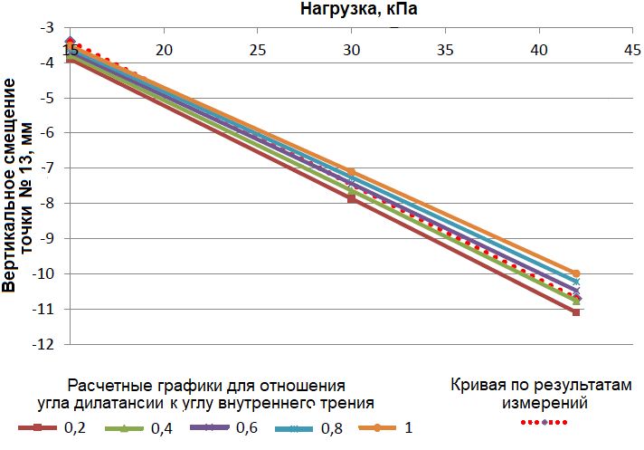 5. На основании сопоставления кривых, построенных по теоретическим и реальным данным, был сделан вывод, что наилучшее соответствие теоретических оценок результатам измерений достигается при угле дилатансии, равном 0,2ϕ‘ (возможно, в легенде к рисунку 9 авторами работы [1] перепутаны цвета графиков для 2ϕ‘ и 0,4ϕ‘, потому что на этом рисунке ближе всего к мониторинговой кривой проходит расчетный график для 0,4ϕ‘. – Ред.). Чтобы убедиться в этом, были проведены дополнительные расчеты смещений точки 13 при отношениях угла дилатансии к углу внутреннего трения 0,1; 0,15; 0,3 и 0,35. Во всех этих случаях отклонения были выше.