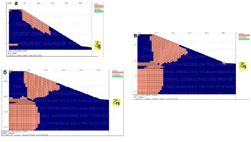 Рис. 10. Распределение зон пластических деформаций на разрезе рассматриваемого откоса при нагрузках 15 кПа (а); 240 кПа (б) и 355 кПа (в)