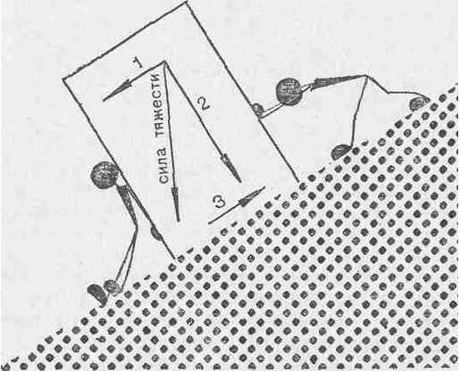 Рис. 5. Силы, действующие на снежный параллелепипед, находящийся на склоне: 1 – составляющая силы тяжести, параллельная склону и стремящаяся сдвинуть снег вниз по наклонной поверхности; 2 – составляющая силы тяжести, перпендикулярная поверхности склона, уплотняющая снег и прижимающая его к склону; 3 – силы сцепления и трения (сопротивления сдвигу). Если же показанный на рисунке параллелепипед рассматривать как часть сплошного снежного покрова на склоне, то его будут удерживать на склоне (или наоборот, тащить с собой) также контурные силы [11]