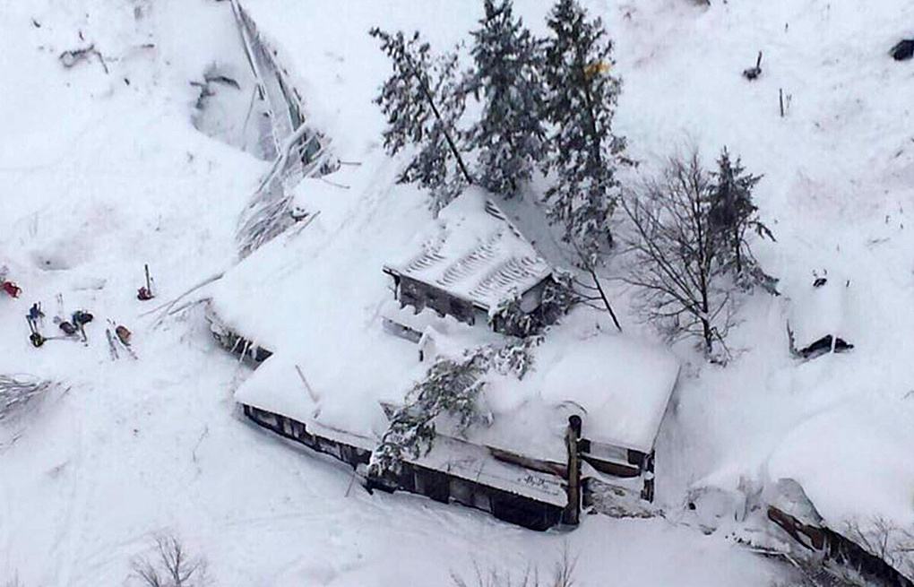 Рис. 1. Лавина, сошедшая в Апеннинских горах в Центральной Италии 18 января 2017 года, сместила здание отеля «Ригопиано» на 10 м и обрушила 3 нижних его этажа, погубив 30 человек [3, 8]