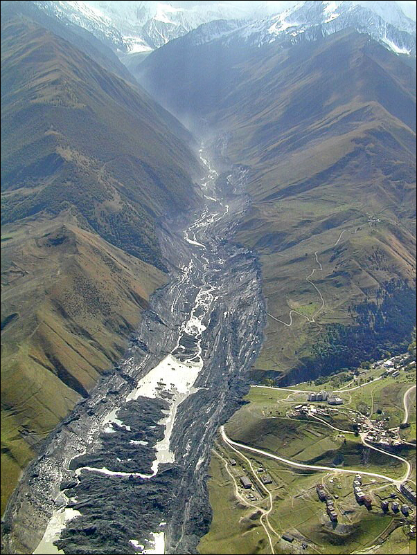 Самой страшной гляциологической катастрофой в России можно считать трагедию в Северной Осетии 20 сентября 2002 года, когда в Кармадонское (Геналдонское) ущелье сошла огромная часть фирново-ледового тела ледника «Колка» (в результате падения на него висячего ледника с вершины Джимарай). Эта масса двинулась вниз со скоростью более 200 км/ч, захватывая с собой сначала новые пласты снега и льда, а затем камни, почвенно-растительный покров, песок, глину и грязевые массы, в результате чего снежно-ледовая лавина превратилась в ходе движения в гляциальный сель (рис. 2). Тогда было полностью уничтожено несколько поселков и погибло более 135 человек, среди которых была и киносъемочная группа под руководством Сергея Бодрова (младшего) в составе 26 человек. Об этой катастрофе в России много писали и еще не раз напишут.