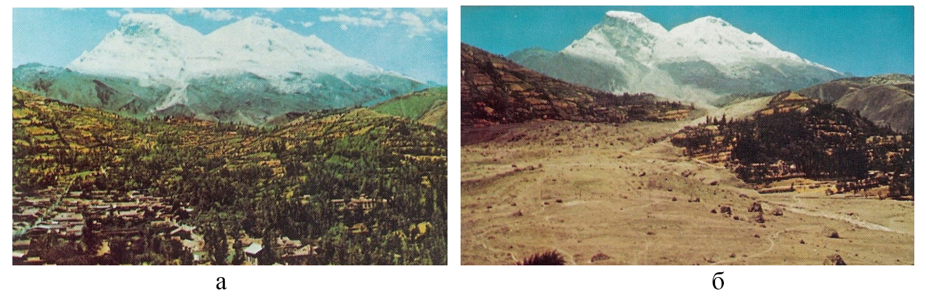 Но всего через 8 лет (31 мая 1970 года) катастрофа в тех же местах повторилась, причем в многократно увеличенном масштабе. На этот раз «спусковым крючком» послужило землятресение с эпицентром в Тихом океане недалеко от побережья Перу, которое дестабилизировало все тот же северный склон Уаскарана, отколов от него полуторакилометровый кусок льда, снега и горных пород – и вниз ринулась новая лавина, стремительно вбирая в себя нижележащие ледники, куски горных пород, воду из высокогорных озер и превращаясь в гляциальный сель. В итоге общий объем снега, льда, обломков, песка, глины и грязи достиг 80 млн куб. м, а путь этой массы составил, по разным данным, от 14,5 до 16,5 км. За несколько минут были уничтожены не только Ранраирка и близлежащие деревни, но и Юнгай с почти всеми его жителями (не менее 20 тыс. человек), а также палаточный лагерь чешских альпинистов (рис. 7, 8).