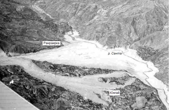 Рис. 11. Погибшие Юнгай и Ранраирка на снимке, сделанном с самолета после схода с Уаскарана ледника в 1970 году (по [23])