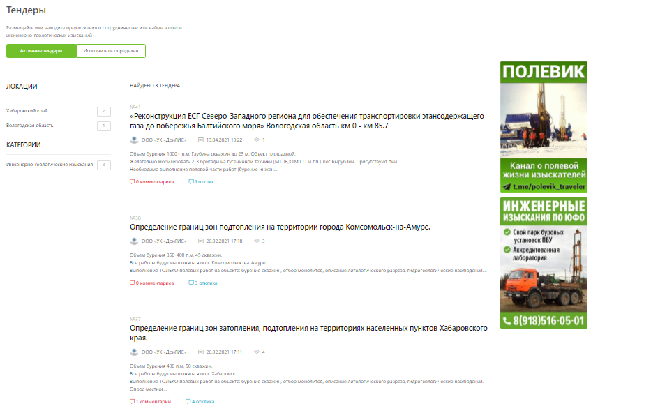 Название раздела говорит само за себя. Здесь можно разместить свой тендер, заявку на работу, коммерческое предложение, изготовление специализированного бурового инструмента, предложение о найме в сфере инженерно-геологических изысканий и многое другое.
