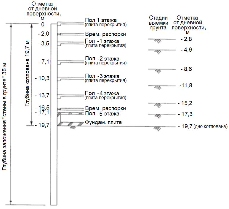 На рисунке 1 показан поперечный разрез проектируемого котлована с указанием стадий выемки грунта, уровней временных распорок и железобетонных плит подземных междуэтажных перекрытий и фундамента, а также соответствующих высотных отметок от дневной поверхности.