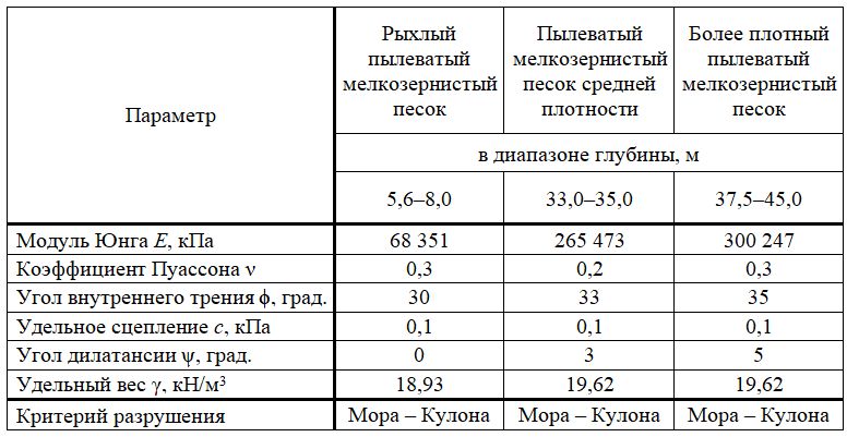 Геологический разрез рассматриваемой площадки состоит из разных слоев песчаных и глинистых грунтов. Было принято, что песчаные слои обладают высокой водопроницаемостью и ведут себя как дренированные материалы. Их поведение моделировалось с применением комплексной геомеханической (конститутивной) модели Мора – Кулона с использованием показателей свойств, приведенных в таблице 1. Также было принято, что глинистые слои имеют низкую водопроницаемость и ведут себя как недренированные материалы. Их нелинейное поведение моделировалось с применением конститутивной модели упрочняющегося грунта (Hardening Soil, HS) с использованием параметров, представленных в таблице 2.