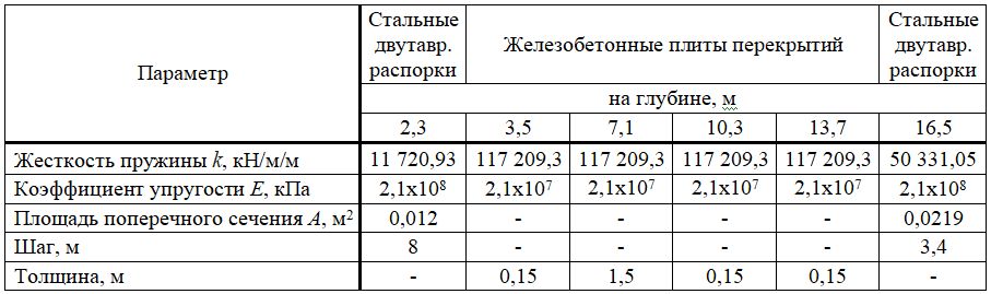 Боковые опоры (временные стальные распорки и бетонные плиты междуэтажных перекрытий) были смоделированы в RS2 с помощью пружинных элементов (при активировании опции Springs в программе RS2), свойства которых перечислены в таблице 3. Величины их удерживающей способности в этой таблице отражены, однако окончательные значения жесткости пружин, которые использовались при моделировании, были рассчитаны на основе понижающего коэффициента 20% применительно к каждой боковой опоре на основе рекомендации из статьи [6].