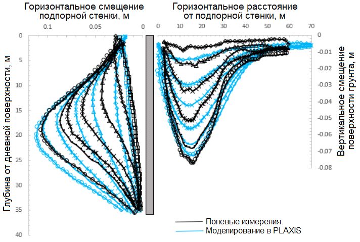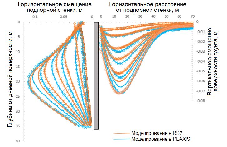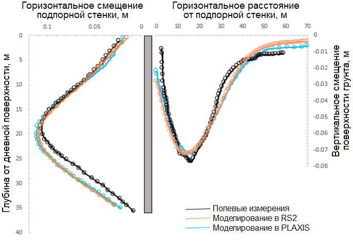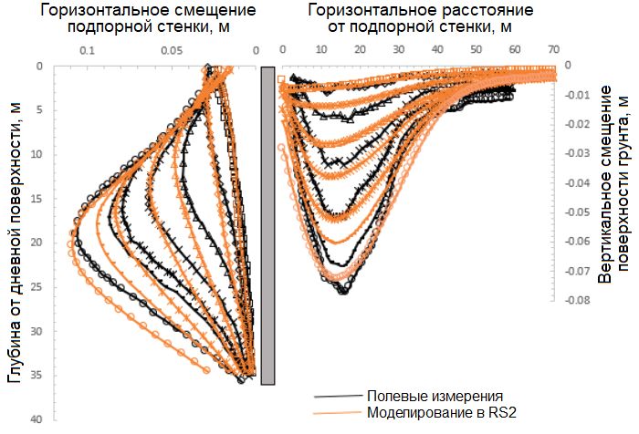 Целью представленной работы являлся анализ поведения бортов рассмотренного выше котлована и окружающего грунта с помощью моделирования в программном комплексе Rocscience RS2. Результаты анализа (горизонтальных смещений подпорной «стены в грунте» и вертикальных смещений (осадок) поверхности окружающего грунта) были сопоставлены с данными полевых измерений и с результатами эквивалентного моделирования в программном комплексе PLAXIS.
