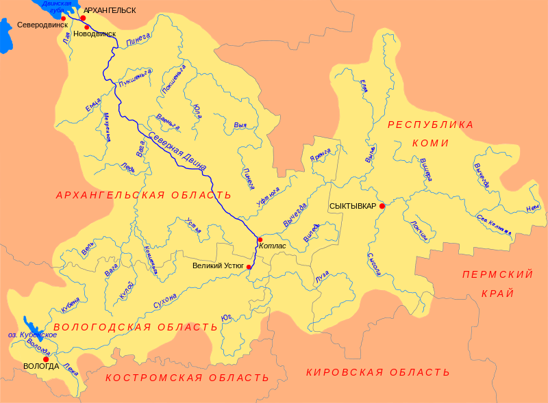 Рис. 1. Карта-cхема бассейна Северной Двины (желтый фон). Север европейской части России [10]