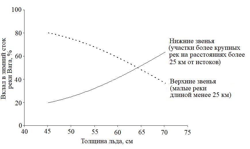 По многолетним данным было установлено, что в более холодные зимы при значительной мощности льда снижается суммарный расход воды в малых реках речных бассейнов. Так, при увеличении максимальной зимней толщины льда с 45 до 70 см суммарный вклад верхних звеньев гидрогафической сети (малых рек) в зимний сток такого крупного притока Северной Двины, как Вага, уменьшается в несколько раз (рис. 5).