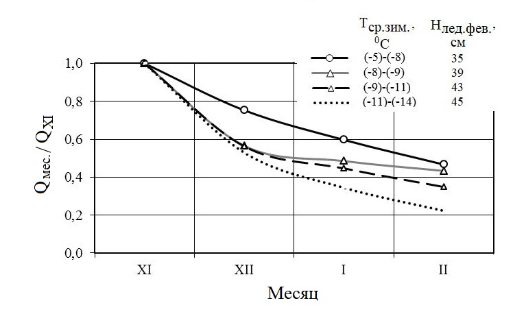 Рис. 6. Гидрографы стока малых рек бассейна Северной Двины для разной средней зимней температуры воздуха (Тср.зим.) и соответствующей февральской толщины льда (Нлед.фев.) за ноябрь – февраль (Qмес., QXI – средний расход воды в реке в текущем месяце и в ноябре соответственно)